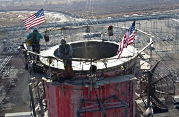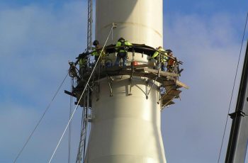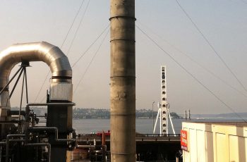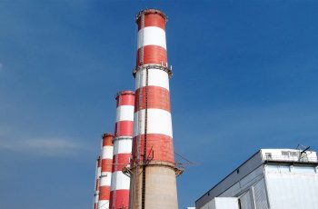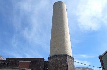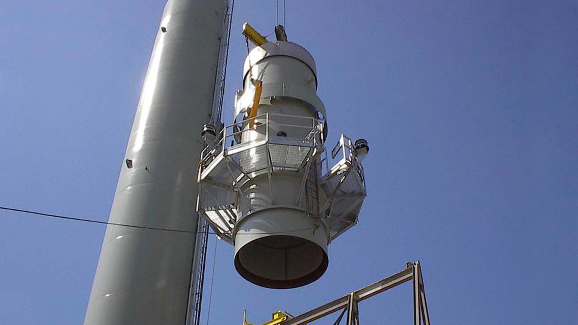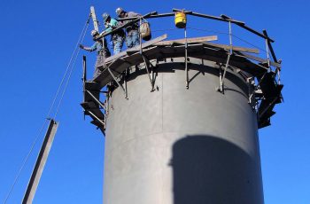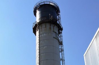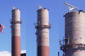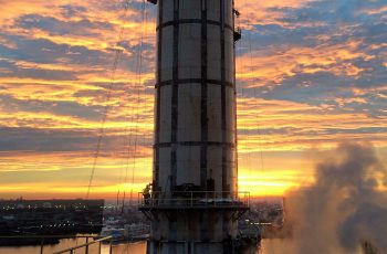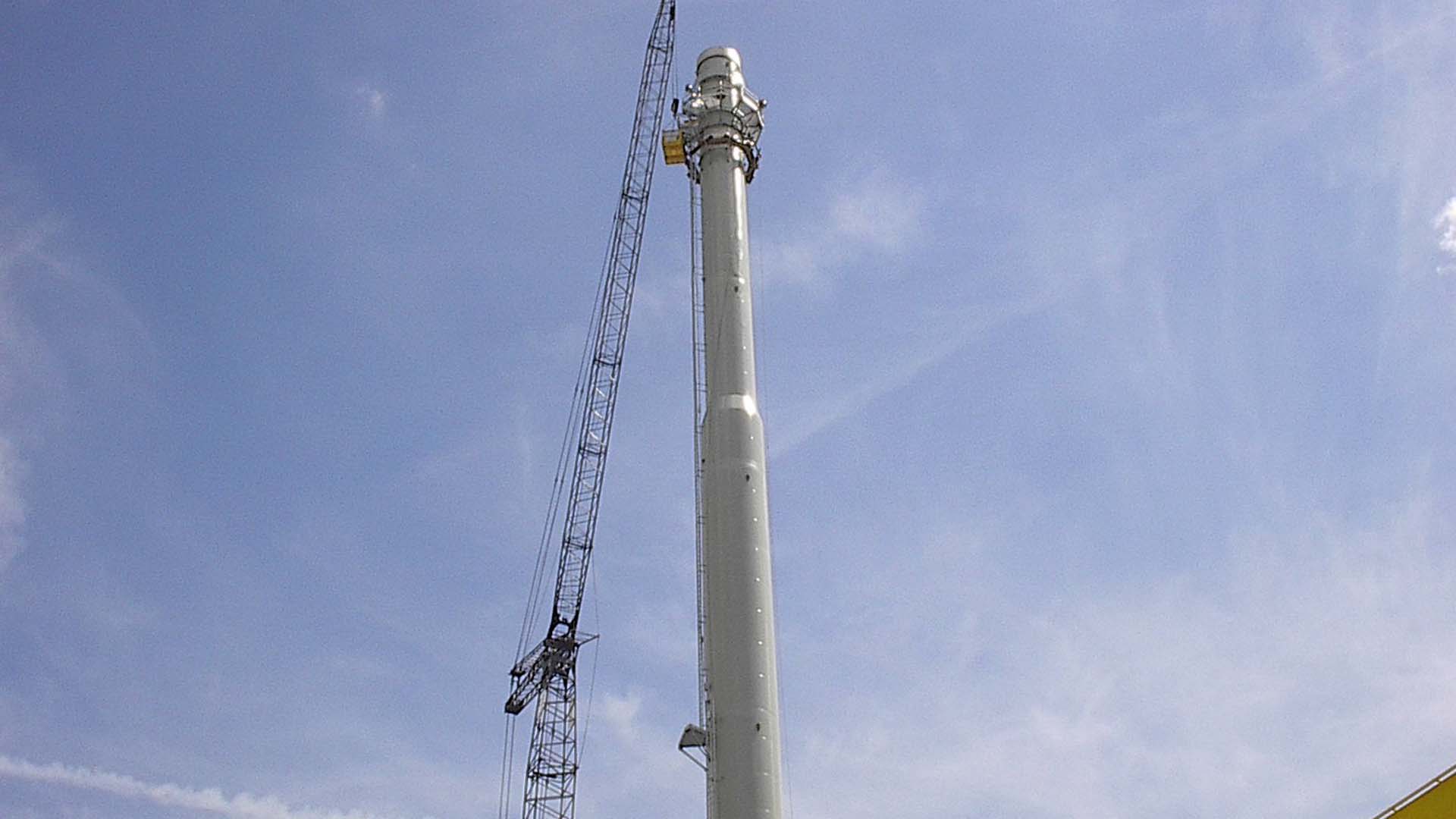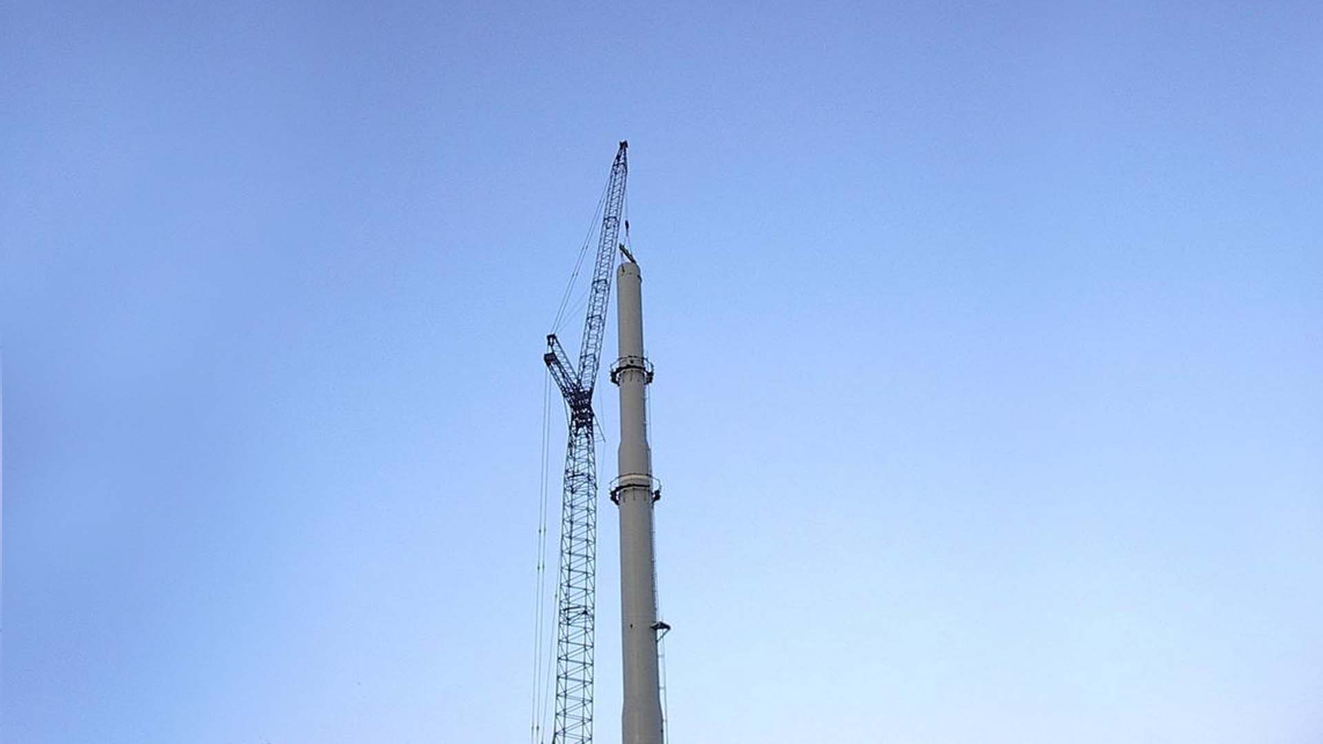 Jansons erected the dual wall stack whose design included a 317L stainless steel liner, A-36 steel shell with an epoxy finish coating, service platforms and aviation obstruction light system. The structure was erected in six sections using a Grove HL-150T lattice boom truck crane with 170′ of the main boom and a 160′ luffing jib section that was re-configured twice to reach the 330′ tip height.