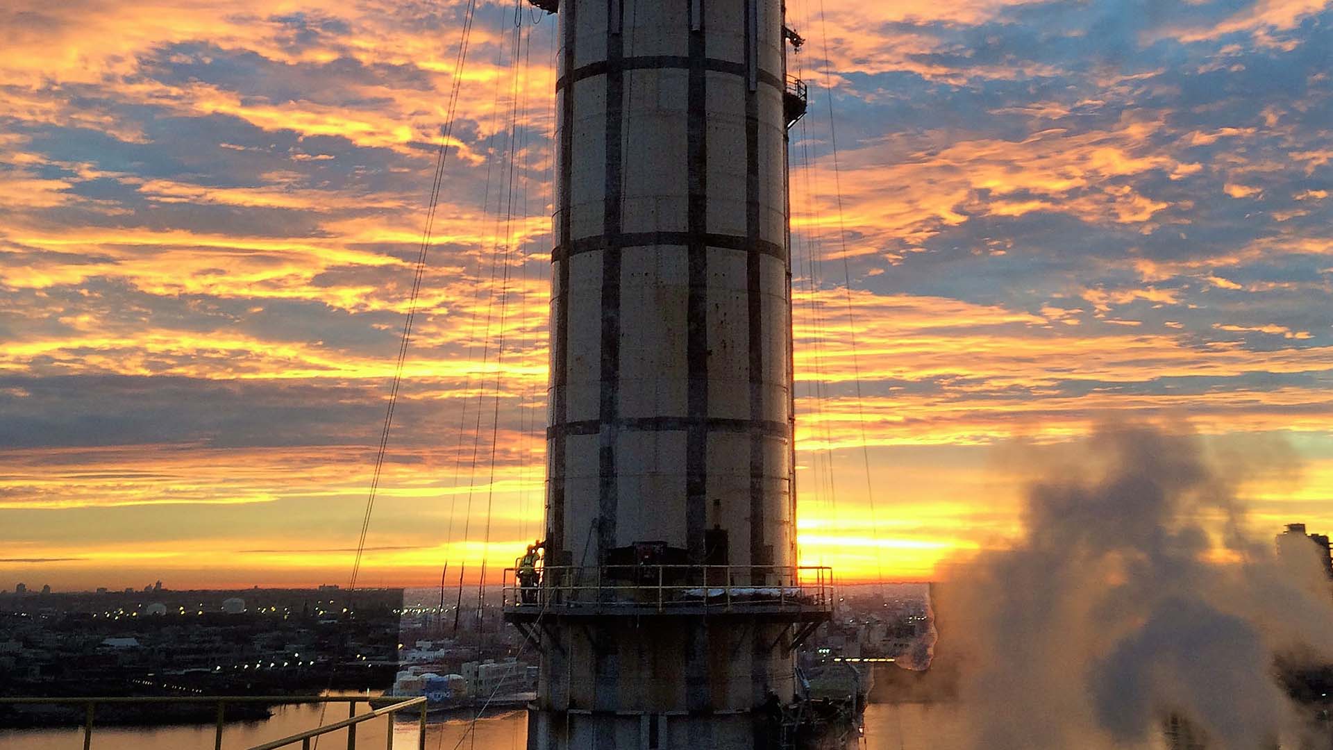 The Unit #2 Stack at Con Ed’s East River Generating Sta. was erected in 1929 when the station went into operation. After 85 years of operation, the riveted steel stack needed reinforcement to compensate for corrosion loss of stack shell plates; as well as to keep current with updated building codes.
