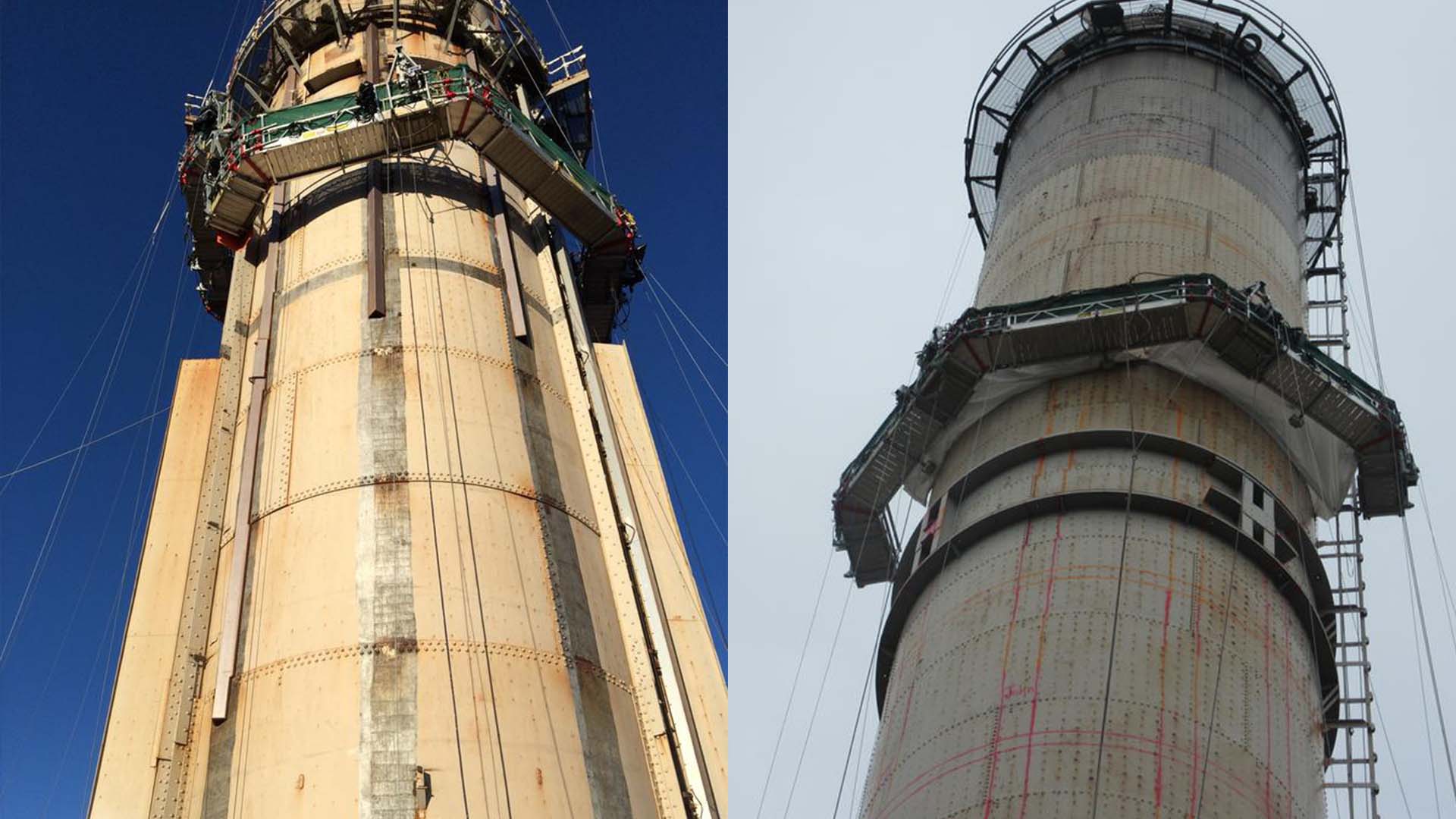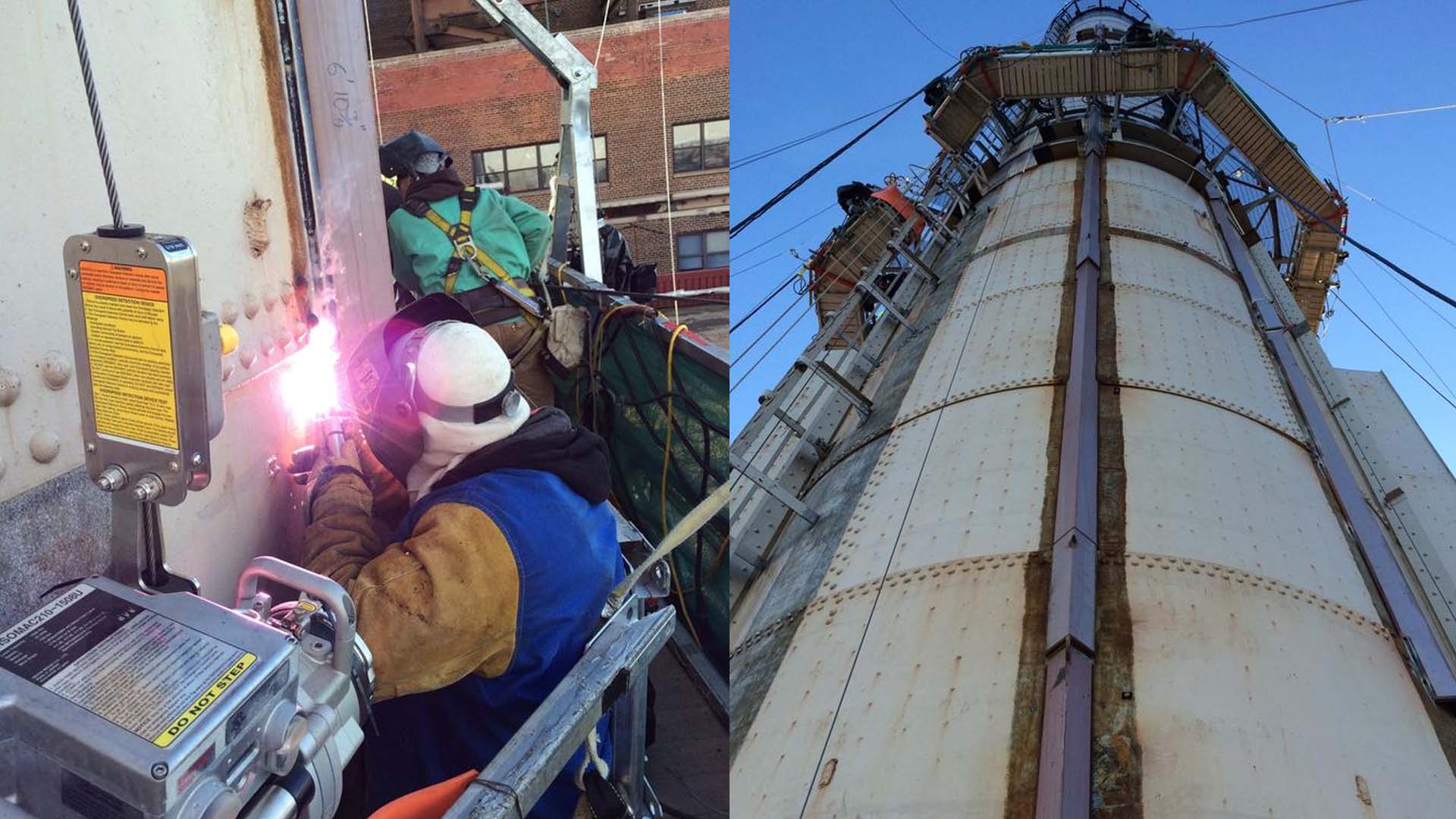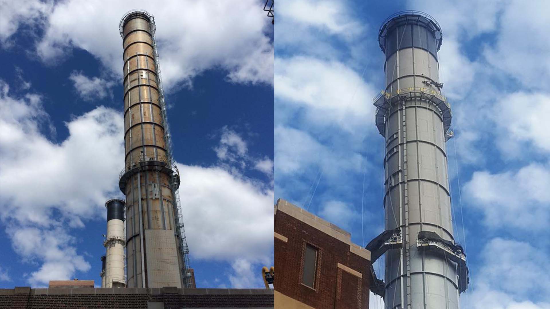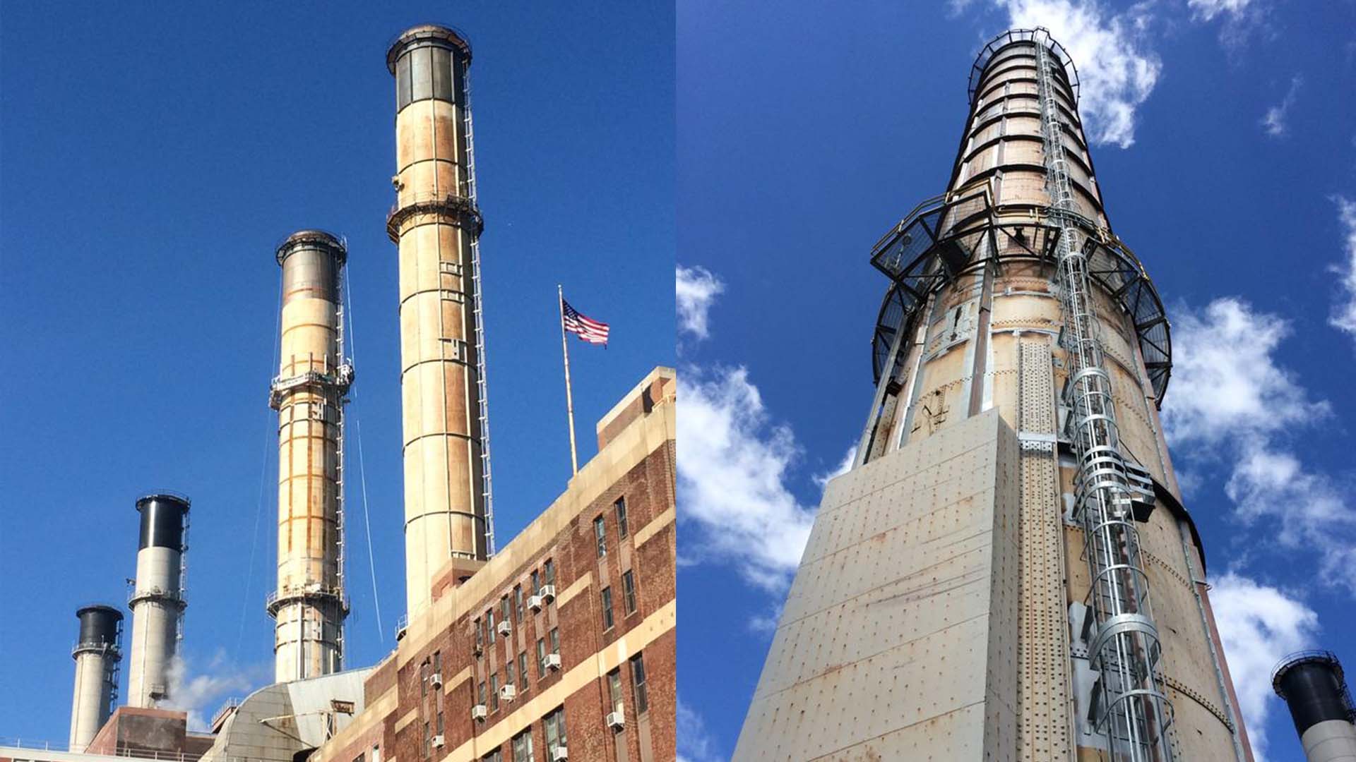 The reinforcement involved the installation of nearly 125,000 lbs. of steel to the structure; which, because the stack is supported at the boilerhose roof, required lifting all materials from the street to the roof elevation. The project scope included: