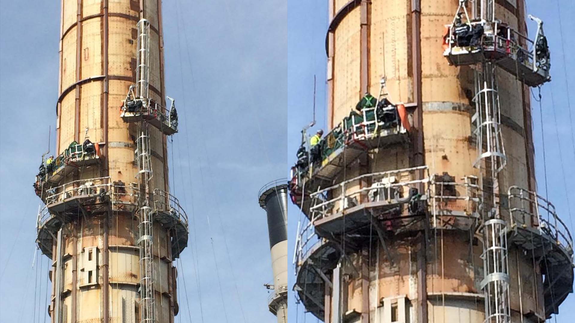 • The erection and continuous welding of (10) 8’x8″x1-1/8″ steel angles, spaced equally around the circumference of the stack over a 175′ section