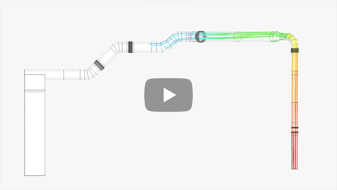 Detailed Velocity Traces Through Elbow Segment: A close-up of particle tracings showing how fluid velocity behaves through a QuenchSafe elbow section.